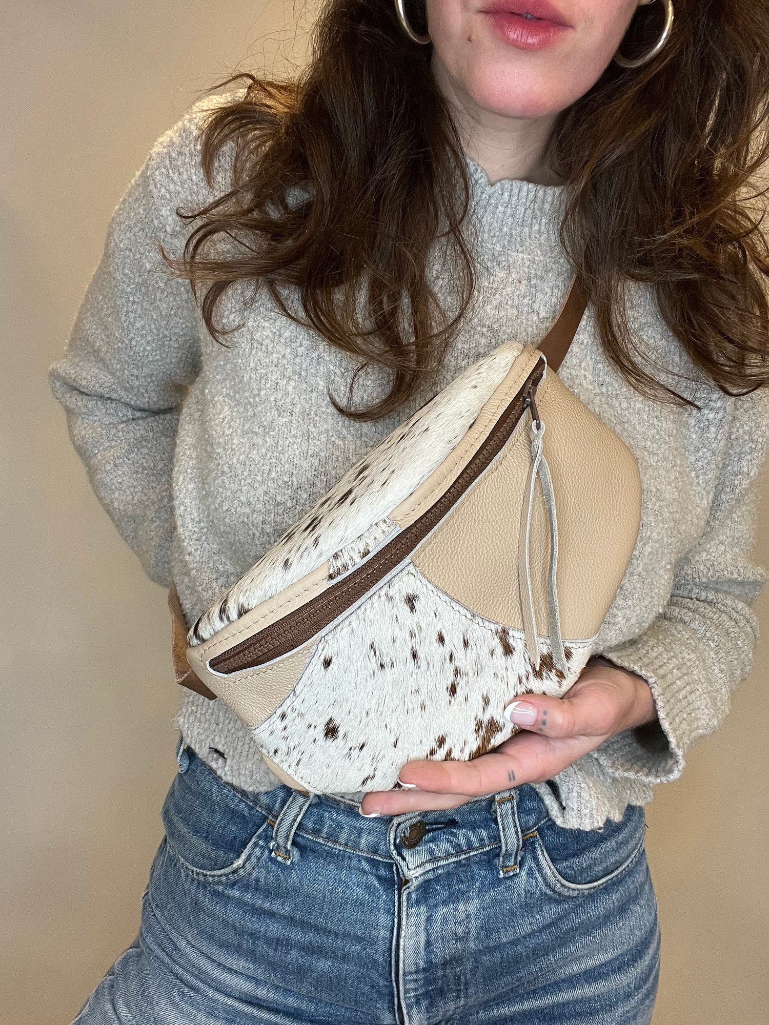Creamy and buttery soft leather top and front with speckled brown and white hair on hide details