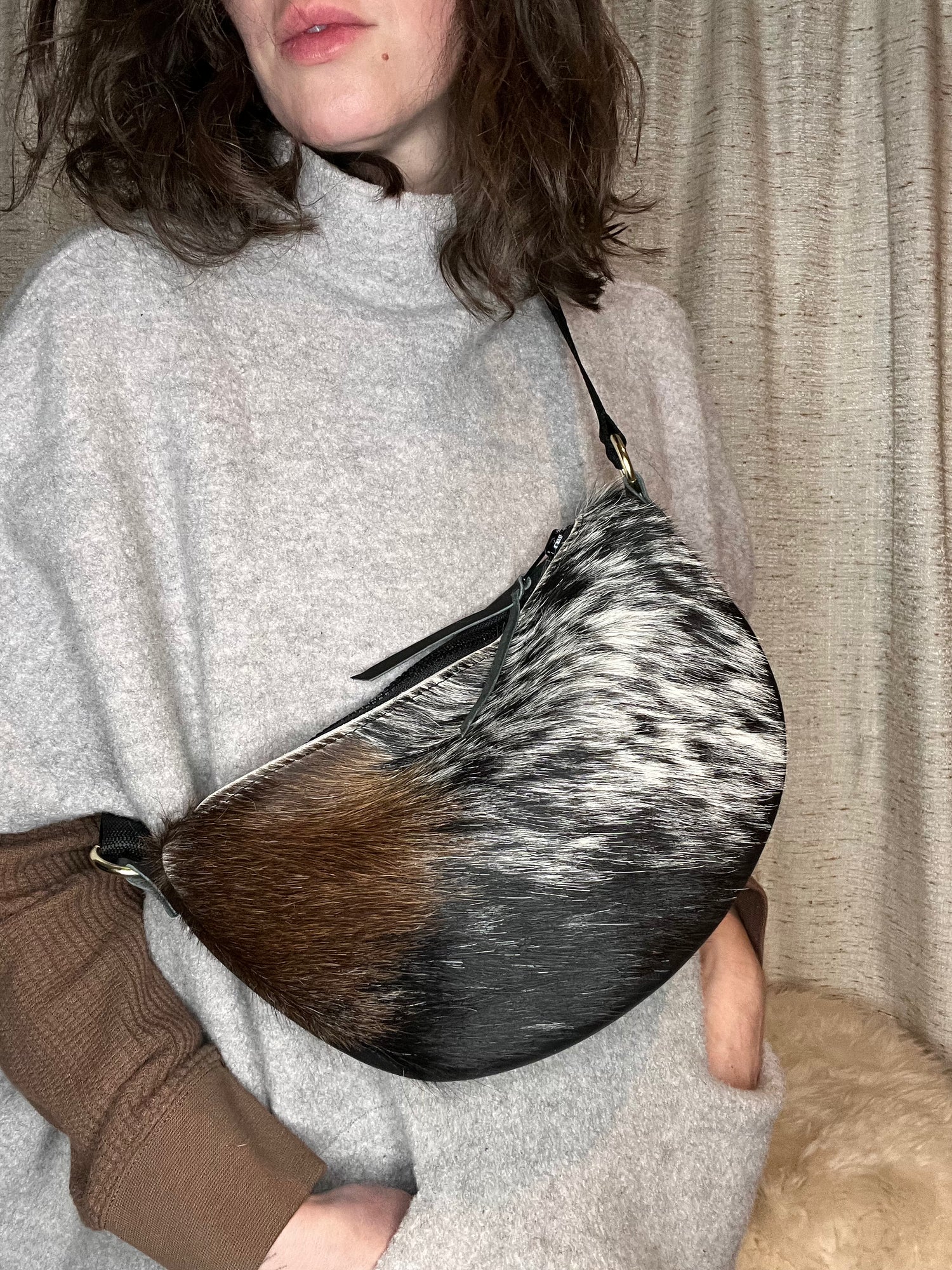 speckled black, white and brown hair on hide front with black leather back and black gusset